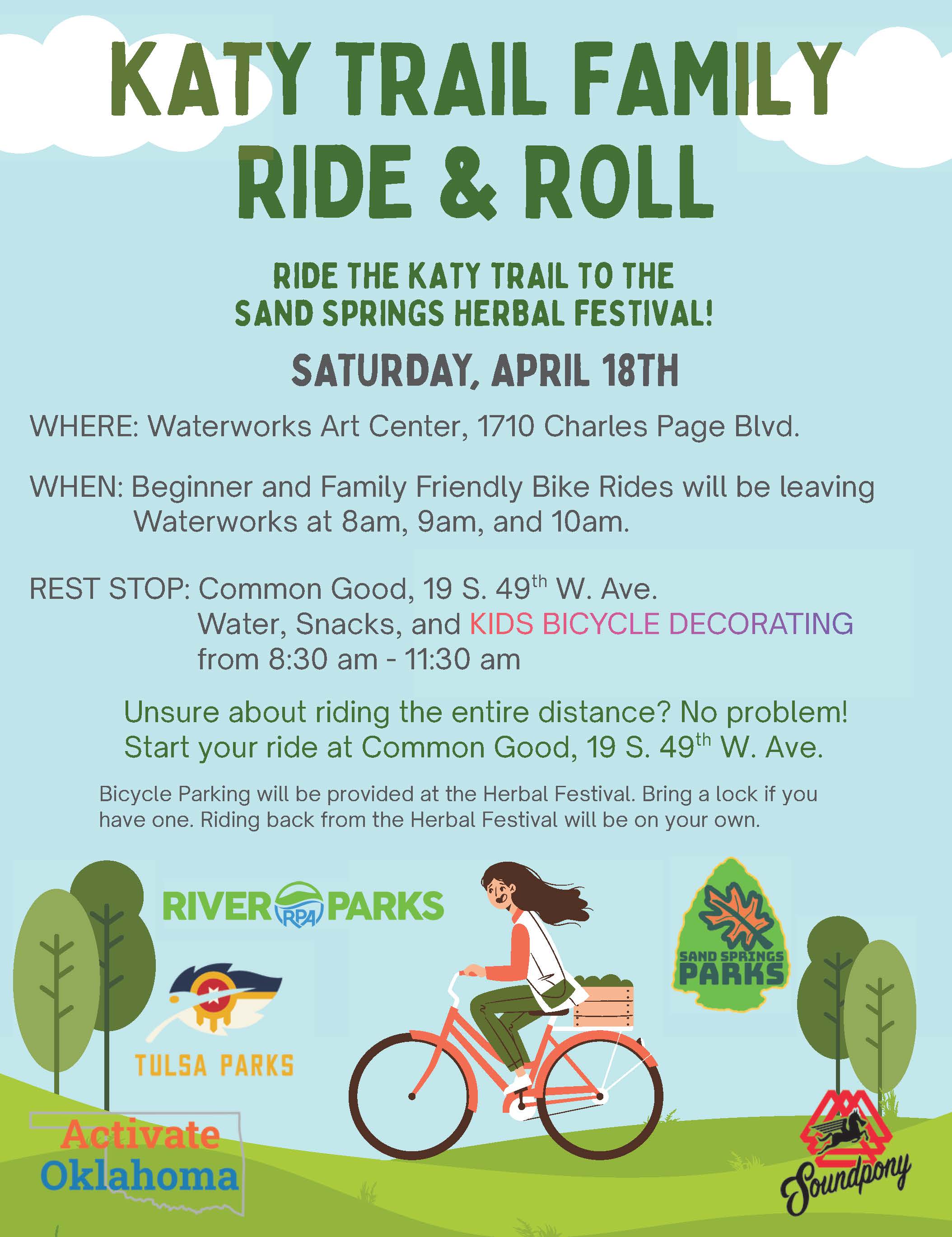 Enjoy a bike ride from Tulsa to Sand Springs with friends, family, parks staff, and local outdoor enthusiasts. This all ages, all abilities ride starts at Waterworks Art Center and ends at the Herbal Affair in Sand Springs.